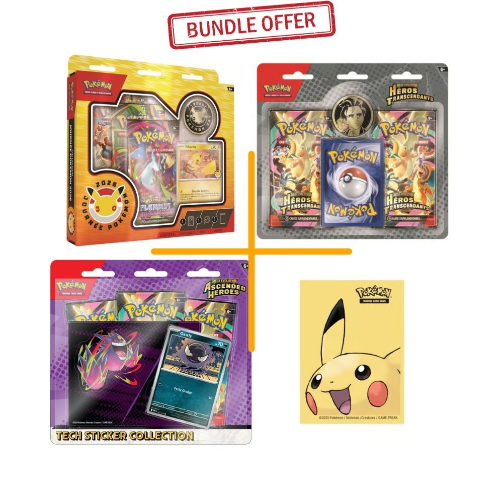 Bundle : 1 Duopack ME2.5 + 1 Tripack ME2.5 + 1 Collection journée Pokémon + Sleeves Pikachu